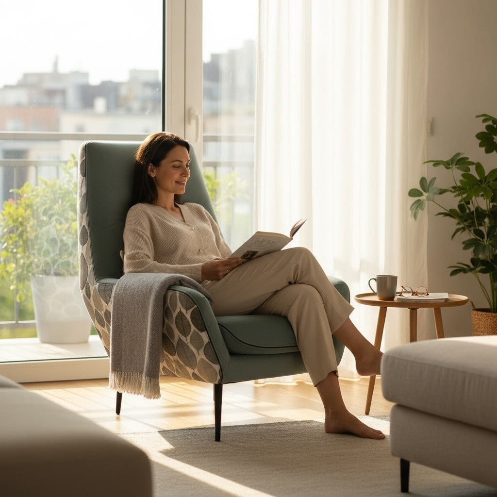 El sillón o butaca Verona combina diseño moderno y funcionalidad con un tapizado verde suave de textura aterciopelada que aporta un ambiente cómodo y acogedor. Su respaldo alto y asiento amplio garantizan una postura ergonómica ideal para momentos de lectura o relajación.
