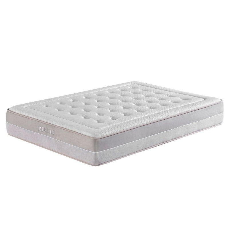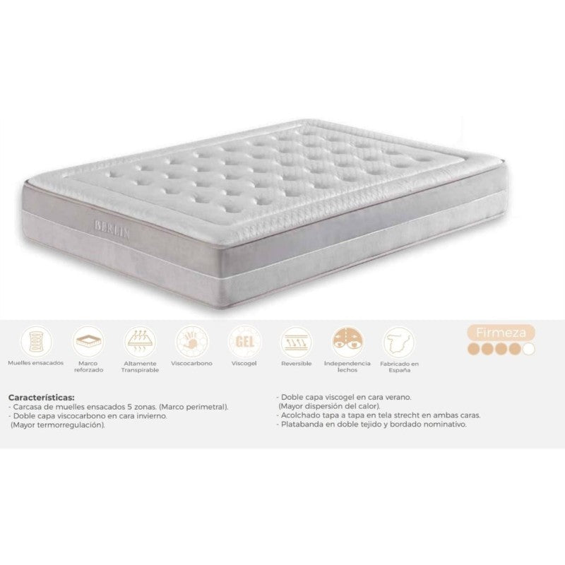 El Colchón Berlín combina muelles ensacados en 5 zonas con doble capa de visco carbono y visco gel para una temperatura perfecta todo el año. Altura 27 cm y firmeza media.